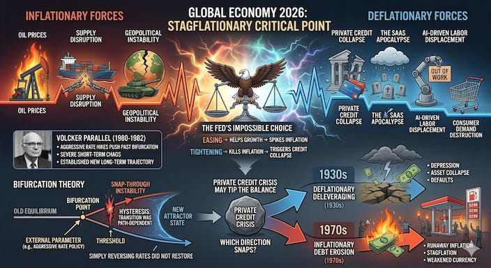 The stagflationary environment of 2026 resembles a thermodynamic phase transition at a critical point. Inflationary forces – oil prices, supply disruption, geopolitical instability – pull in one direction. Deflationary forces – private credit collapse, the SaaS Apocalypse, AI-driven labor displacement, consumer demand destruction – pull in the other. At the critical point, the system becomes highly unstable because the competing forces balance out without resolution. The economy cannot settle into a distinct phase, producing the wild, chaotic fluctuations that physicists call critical opalescence. The economy now faces similar circumstances: easing helps growth but spikes inflation; tightening kills inflation but triggers credit collapse.