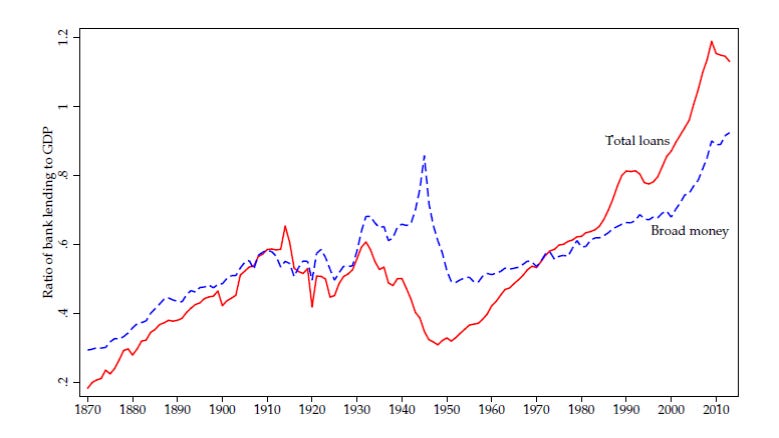 In the 18 months before the 1929 crash, 30-40% of all share investments were purchased using non-bank “shadow” credit available on exchange floors, entirely outside regulated banking. Average bank credit to GDP in 1928 was about 60%, a level the US reached again around 2007. By early 2026, domestic credit to the private sector reached 200% of GDP in 2024, and over 250% when including the full financial sector. The Jorda-Schularick-Taylor Macrohistory Database produced what researchers call the “financial hockey stick.” This is the ratio of aggregate private credit to income which remained near a flat 50% plateau from 1870 until the 1970s, before surging steeply past 100%.