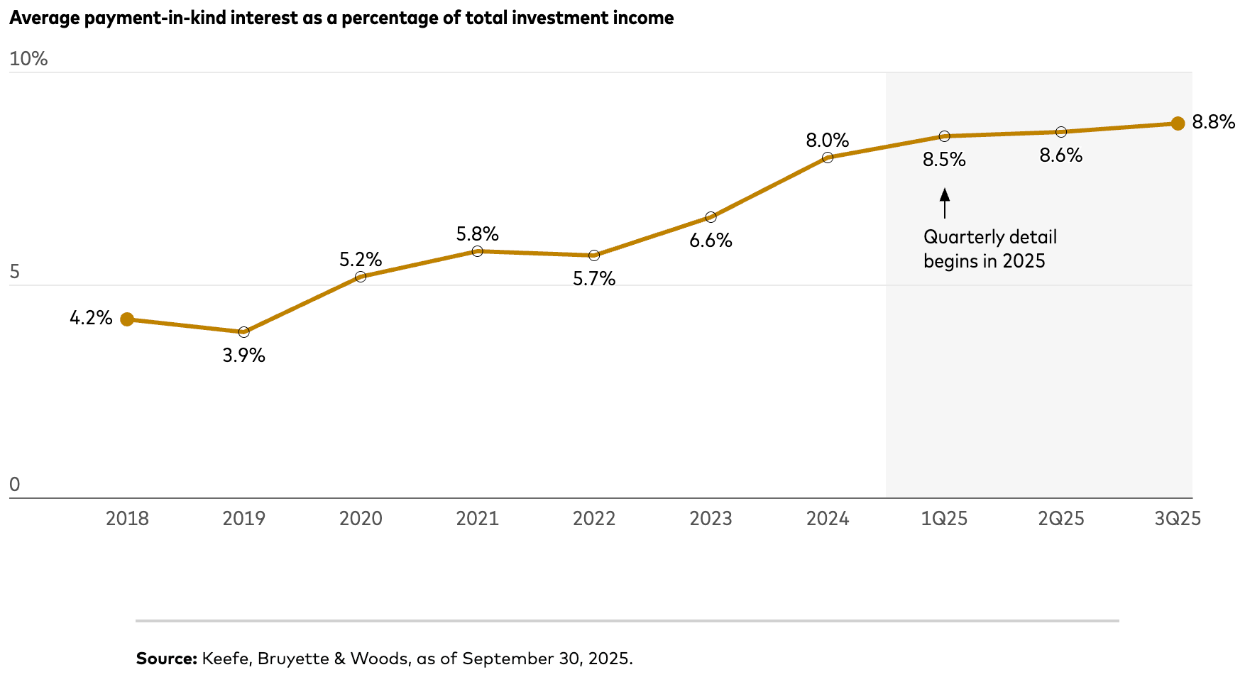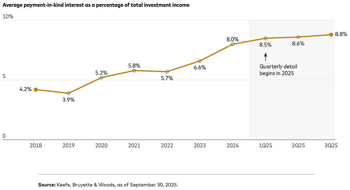 Payment-in-Kind (PIK) allows distressed borrowers to defer cash interest by capitalizing it onto the loan principal. The fund collects no actual cash but the loan stays marked at par on the books while the borrower survives another quarter. And the ticking time bomb of inflating principal balances grows larger with every quarter.