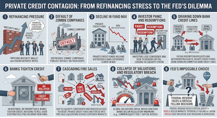The chain of events traces a clear path. Maturity walls force refinancing at punitive rates, zombies default publicly, fund NAVs collapse, investors panic, funds drain bank credit lines, banks tighten, fire sales cascade, and the Fed faces the impossible choice: rescue markets (fueling inflation) or fight inflation (triggering depression).