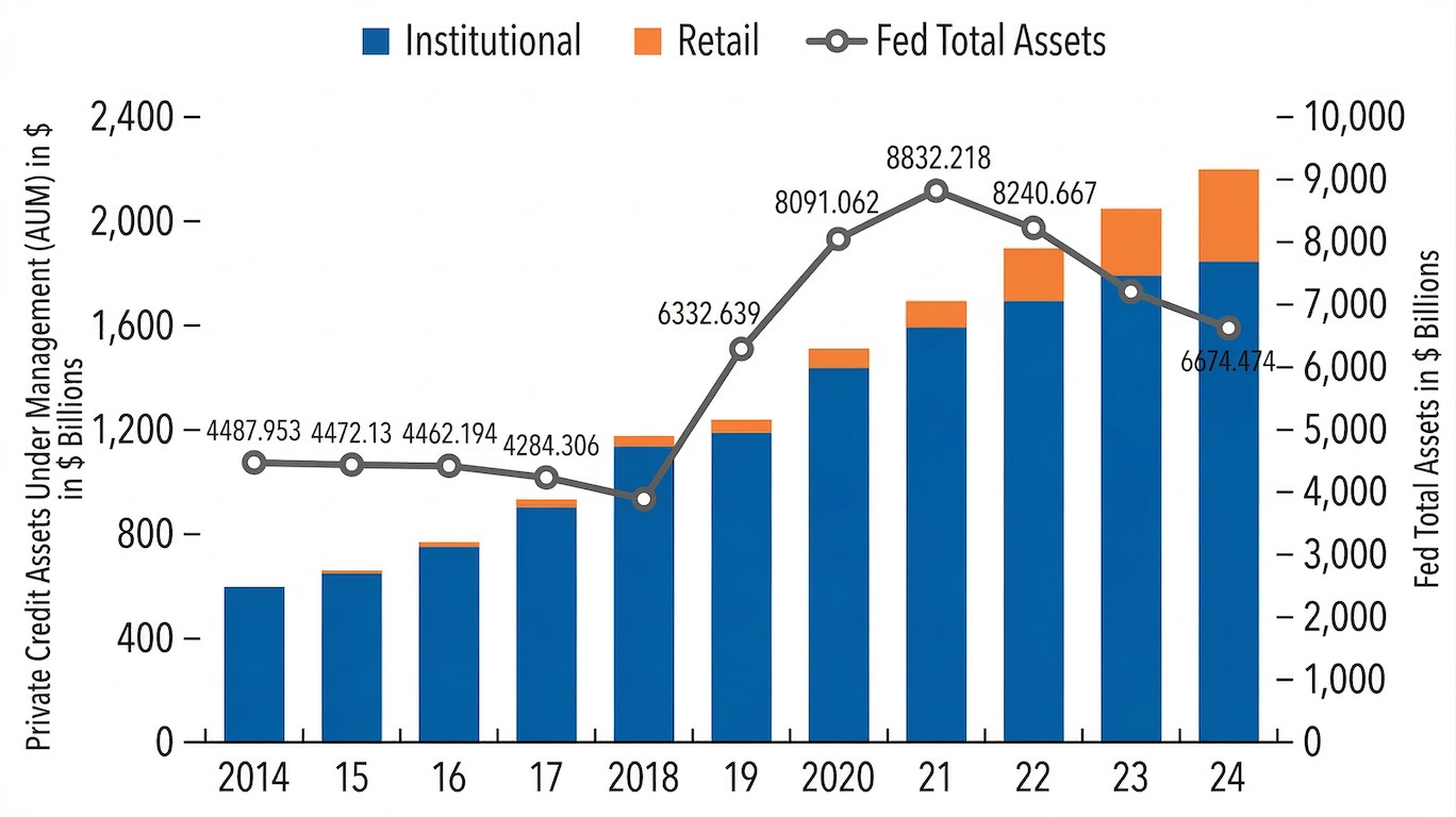 The market grew from roughly $200 billion in 2010 to over $2 trillion in AUM by early 2026 through fund structures alone. When including the broader ecosystem of bank warehouse lines, subscription facilities, and leveraged fund-level borrowing, the total footprint approaches $3.5 trillion. This growth was a direct consequence of the ZIRP era (2008-2022) when yield-starved investors poured into private credit. This happened as banks, constrained by post-GFC regulation, retreated from riskier lending, and private credit filled the vacuum by lending to entities that the regulated system would not touch. And this has been so pervasive that the growth of private credit remained steady despite periods of Fed balance sheet contraction during The Great Stagnation.
